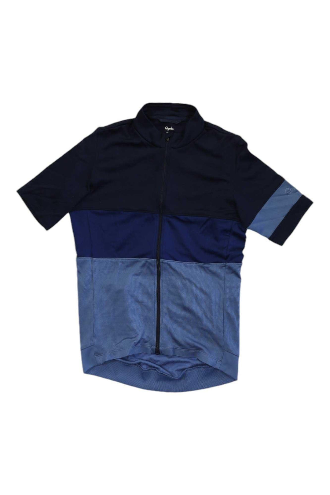 Meet the Rapha Short Sleeve Tricolor Jersey, a sleek cycling top designed to elevate your performance on the road. Crafted with a lightweight and breathable fabric, this jersey offers superior ventilation, keeping you cool and comfortable even on intense rides. Its color block design, featuring three shades of blue, adds a touch of style to your cycling ensemble.